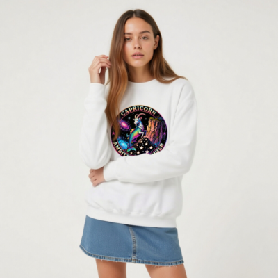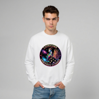Celebrate your Capricorn spirit with this unisex crew neck sweatshirt featuring a vibrant, cosmic goat climber—symbolizing ambition and resilience. The eye-catching design blends rainbow scales, starry nebulae, and cliffside imagery for a bold, astrology-inspired look. Soft, comfortable fit, perfect for daily wear or zodiac enthusiasts. Ideal gift for ambitious dreamers born under the sign of Capricorn.