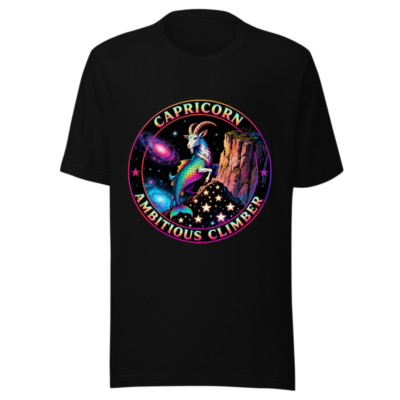 Capricorn Ambitious Climber Unisex T-Shirt – Rainbow Goat Cosmic Design