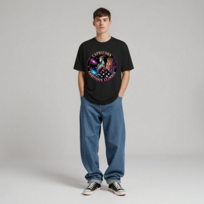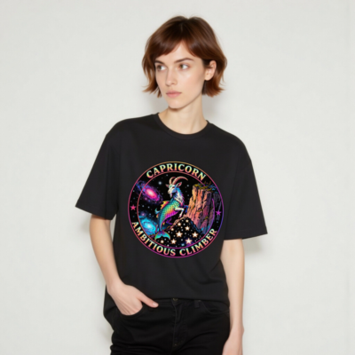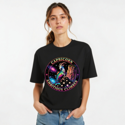 Celebrate your zodiac spirit with this unisex staple t-shirt featuring a vibrant, cosmic Capricorn design: a rainbow-scaled goat climbing a cliff against a starry galaxy backdrop. The ‘Ambitious Climber’ motif captures the sign’s drive and resilience. Soft cotton blend, classic fit, perfect for astrology lovers and dream chasers.