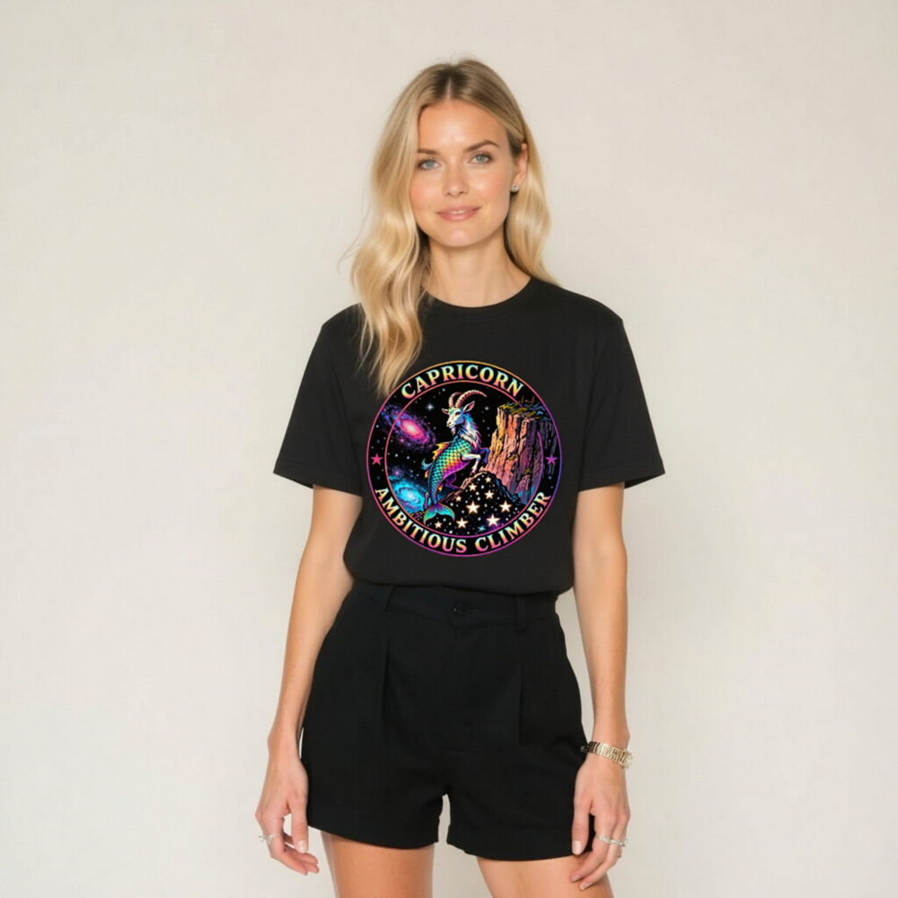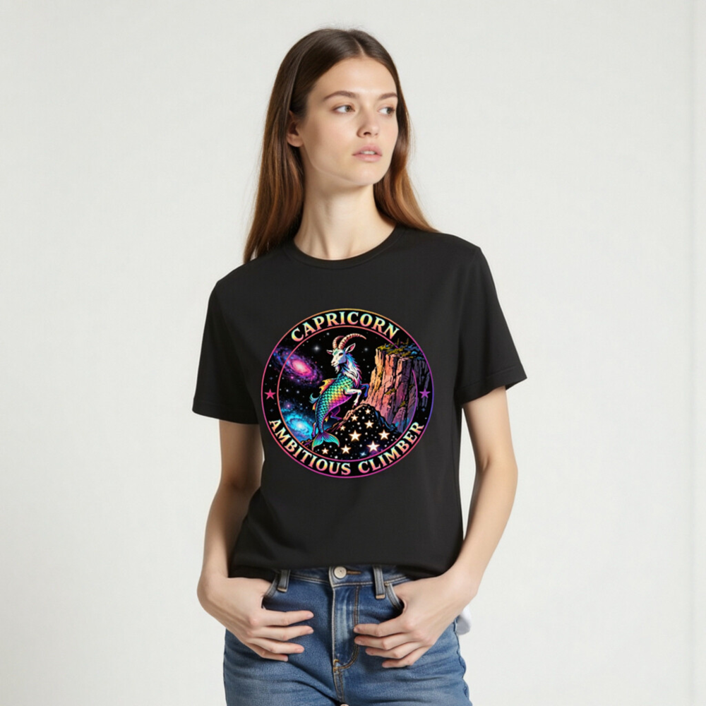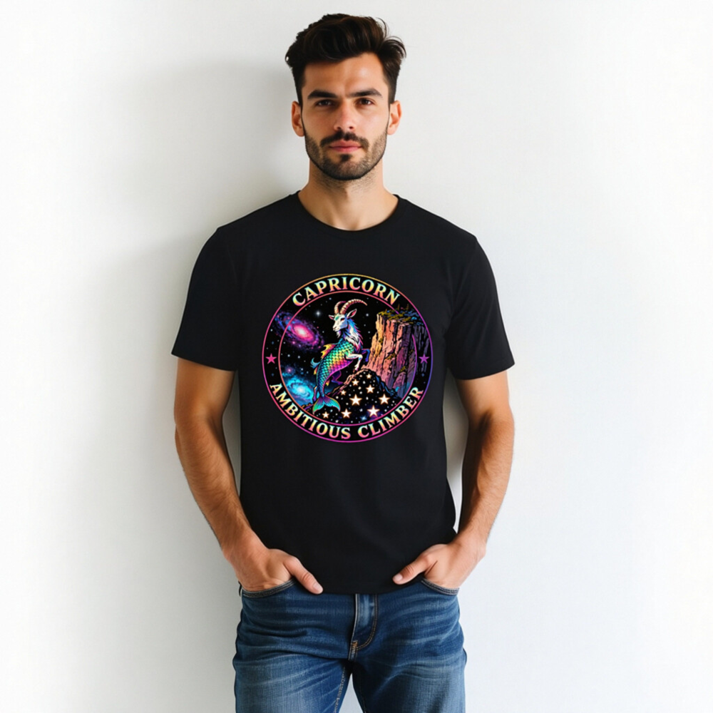 Celebrate your zodiac spirit with this unisex staple t-shirt featuring a vibrant, cosmic Capricorn design: a rainbow-scaled goat climbing a cliff against a starry galaxy backdrop. The ‘Ambitious Climber’ motif captures the sign’s drive and resilience. Soft cotton blend, classic fit, perfect for astrology lovers and dream chasers.