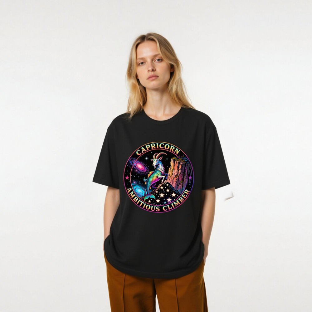 Capricorn Ambitious Climber Unisex T-Shirt – Rainbow Goat Cosmic Design