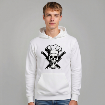 Wear bold culinary art with this unisex eco hoodie featuring a striking chef skull, crossed knives, and garlic—perfect for foodies and edgy style lovers. Made from sustainable materials, it’s soft, comfortable, and designed for everyday wear. Ideal for chefs, cooks, or anyone who loves kitchen-themed fashion. Premium print, relaxed fit, and ethical production.