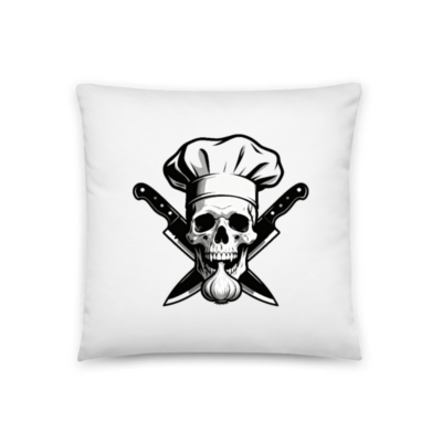 A bold 18″ x 18″ decorative throw pillow featuring a striking black-and-white chef skull with crossed knives and garlic. Perfect for kitchen, bar, or rustic decor lovers. High-quality fabric, square design, machine washable for easy care. Ideal gift for chefs, foodies, or Halloween enthusiasts. Premium print, durable construction, ready to elevate any space.
