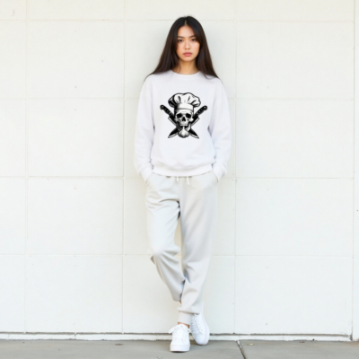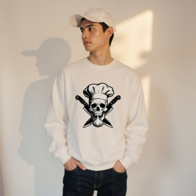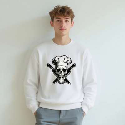 A bold unisex crew neck sweatshirt featuring a striking black-and-white graphic: a skull wearing a chef’s hat, crossed knives, and a garlic bulb—perfect for culinary enthusiasts. Soft, comfortable fit with classic design. Ideal for chefs, food lovers, or anyone who embraces dark humor in the kitchen. Available in all sizes.