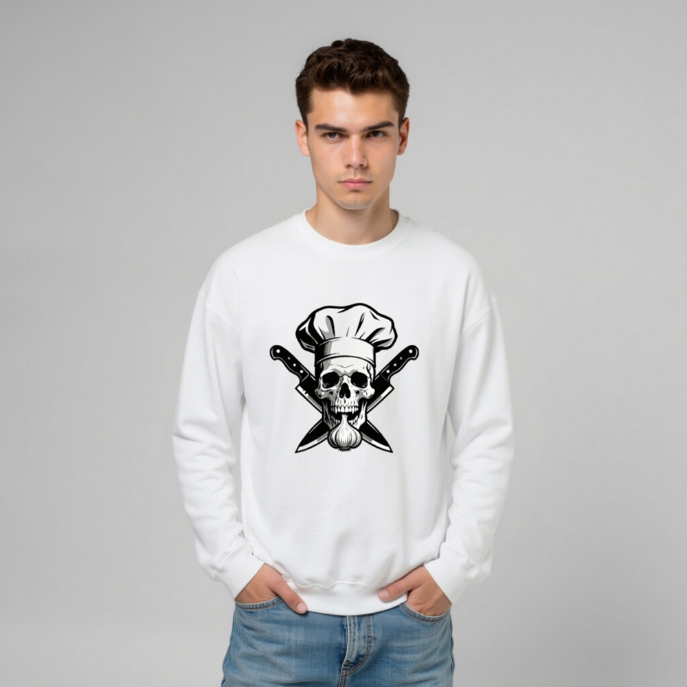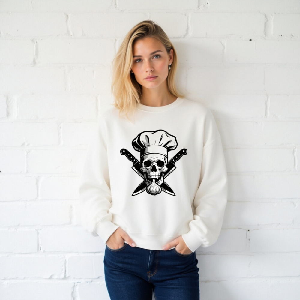 A bold unisex crew neck sweatshirt featuring a striking black-and-white graphic: a skull wearing a chef’s hat, crossed knives, and a garlic bulb—perfect for culinary enthusiasts. Soft, comfortable fit with classic design. Ideal for chefs, food lovers, or anyone who embraces dark humor in the kitchen. Available in all sizes.
