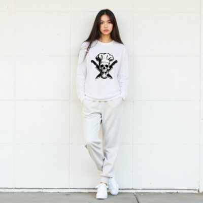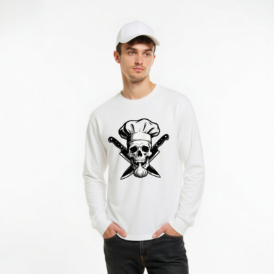 Unisex long sleeve tee featuring a bold black-and-white graphic: a skull wearing a chef hat, crossed knives, and a garlic bulb. Premium cotton blend for comfort and durability. Perfect for culinary enthusiasts, foodies, or anyone who loves edgy kitchen-themed apparel. Ideal for casual wear, cooking events, or as a unique gift. Available in multiple sizes for men, women, and unisex fit.