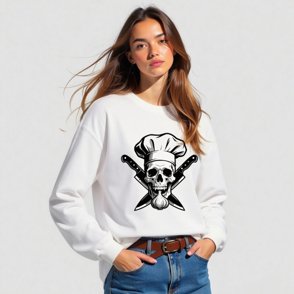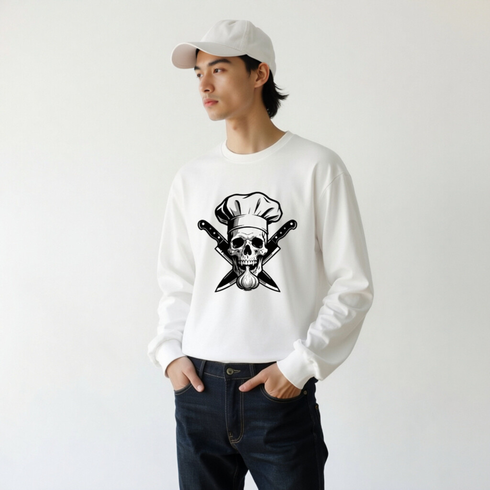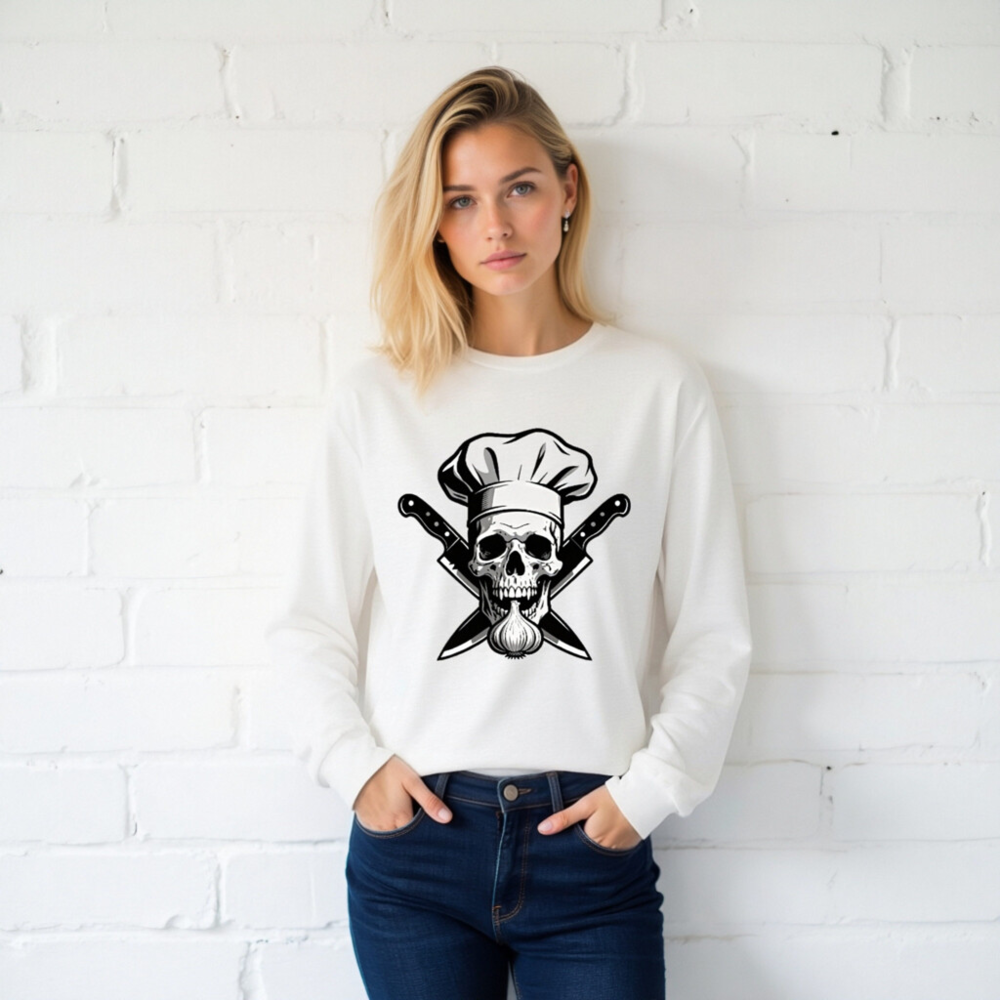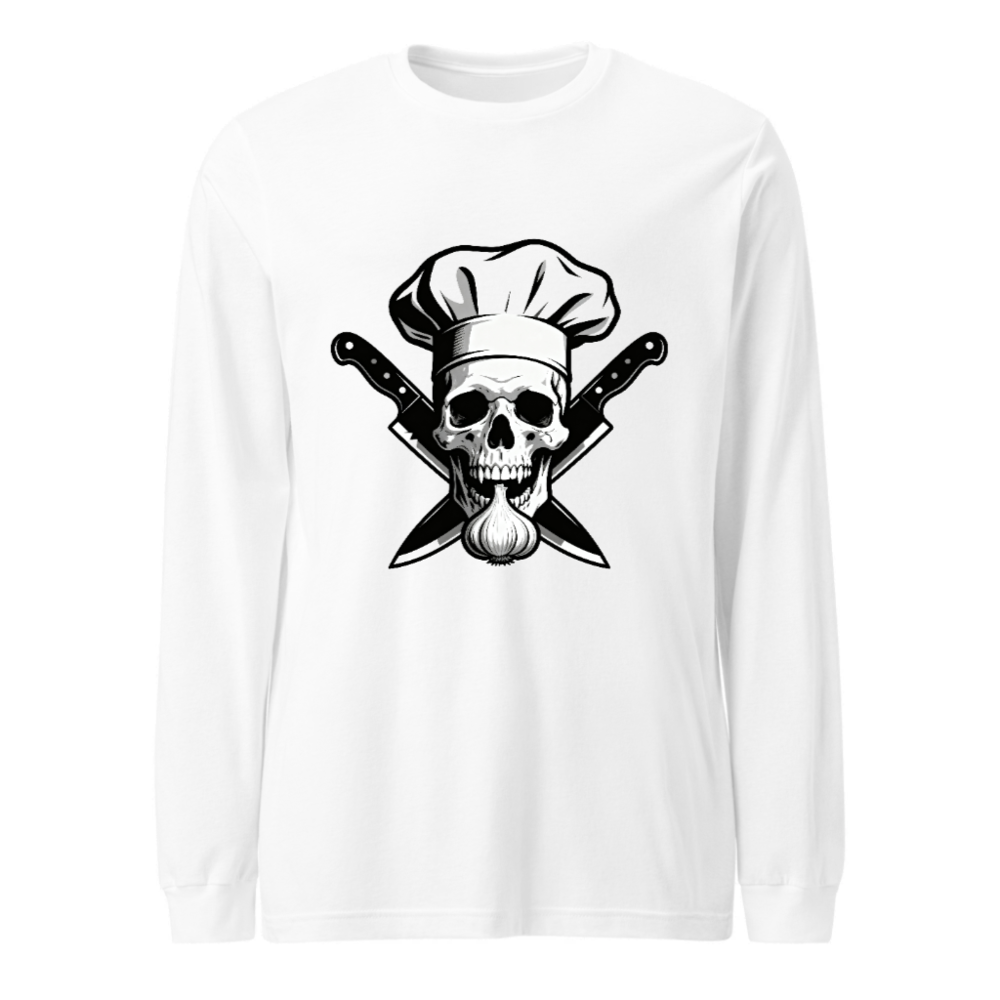 Unisex long sleeve tee featuring a bold black-and-white graphic: a skull wearing a chef hat, crossed knives, and a garlic bulb. Premium cotton blend for comfort and durability. Perfect for culinary enthusiasts, foodies, or anyone who loves edgy kitchen-themed apparel. Ideal for casual wear, cooking events, or as a unique gift. Available in multiple sizes for men, women, and unisex fit.