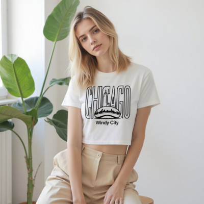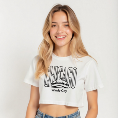 Show off your Chicago pride with this stylish women’s crop top featuring bold ‘CHICAGO’ lettering, iconic skyline silhouette (including the Willis Tower), and the famous Cloud Gate ‘The Bean’ sculpture. Perfect for tourists, locals, or as a fun souvenir. Soft cotton blend, comfortable fit, and officially licensed Chicago-themed design. Ideal for summer outings, city walks, or as a gift for Chicago lovers.
