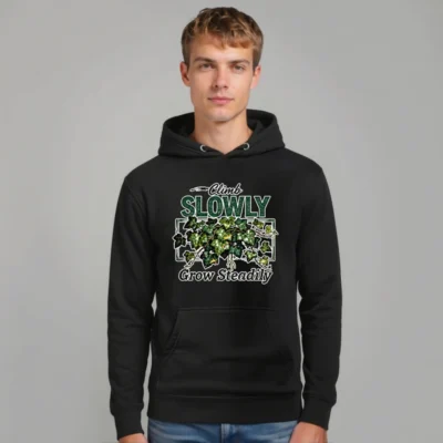 This unisex premium pullover hoodie features the inspiring ‘Climb Slowly, Grow Steadily’ design with lush ivy graphics—symbolizing patience, resilience, and mindful growth. Made from soft, durable fabric with a classic fit, front pouch pocket, and adjustable drawstring hood. Perfect for everyday wear, outdoor lovers, or anyone embracing a steady, intentional lifestyle. Ideal for gifting or self-expression. Machine washable, fade-resistant print ensures long-lasting vibrancy.