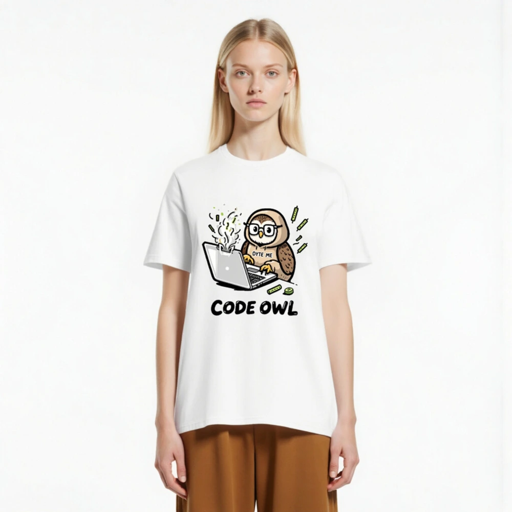 Code Owl T-Shirt – Unisex Organic Cotton Tee | OYTE ME Laptop Owl Design