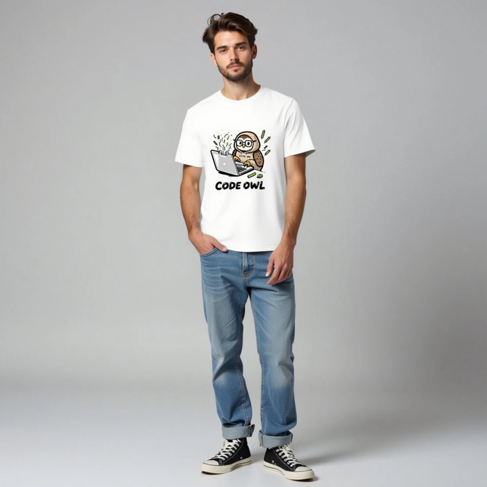 This unisex organic cotton t-shirt features a playful ‘Code Owl’ design with an owl coding on a steaming laptop, surrounded by circuit elements. The soft, eco-friendly fabric ensures comfort and sustainability. Perfect for developers, tech lovers, or anyone who appreciates witty tech humor. Made with certified organic cotton—no synthetic additives or harmful dyes.
