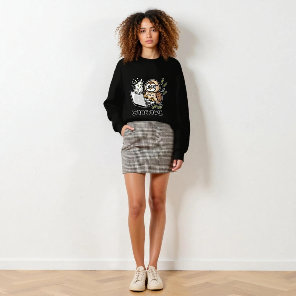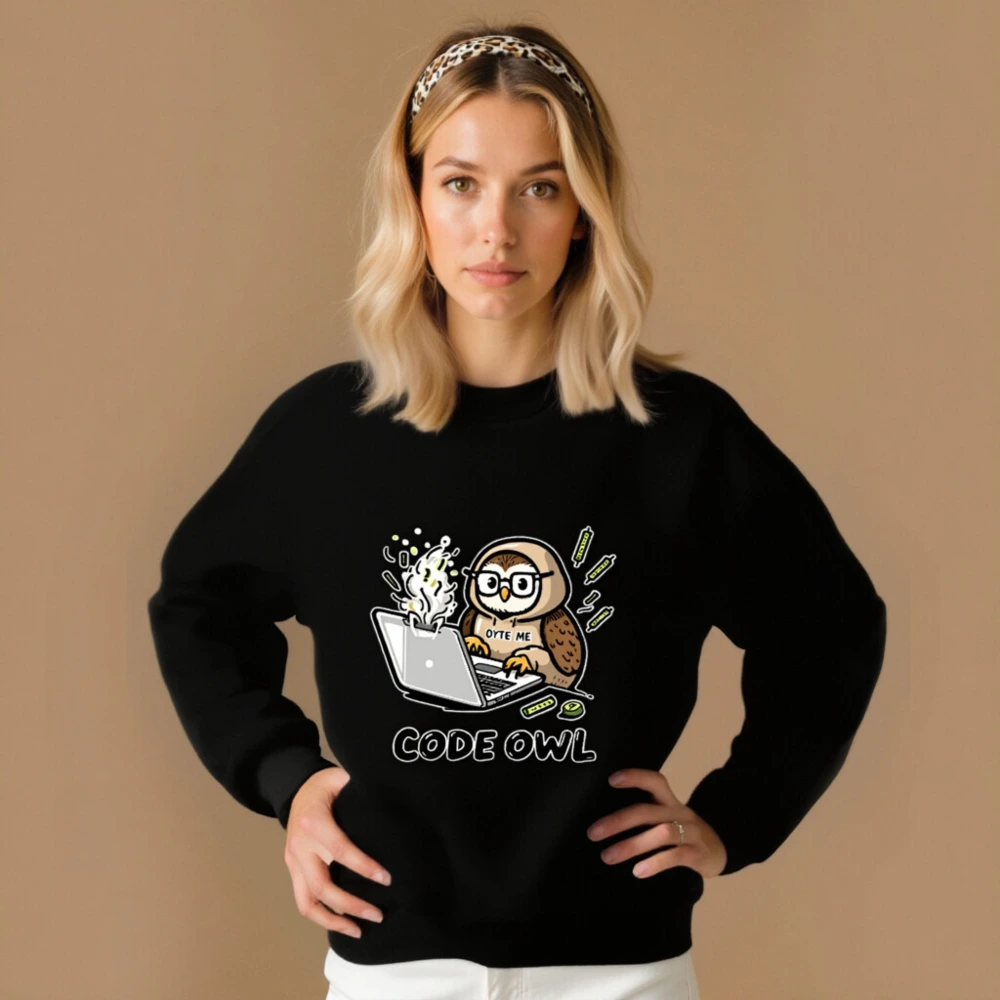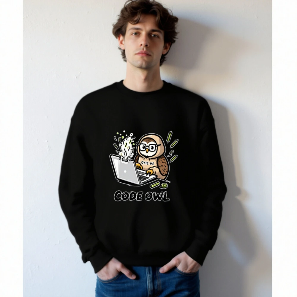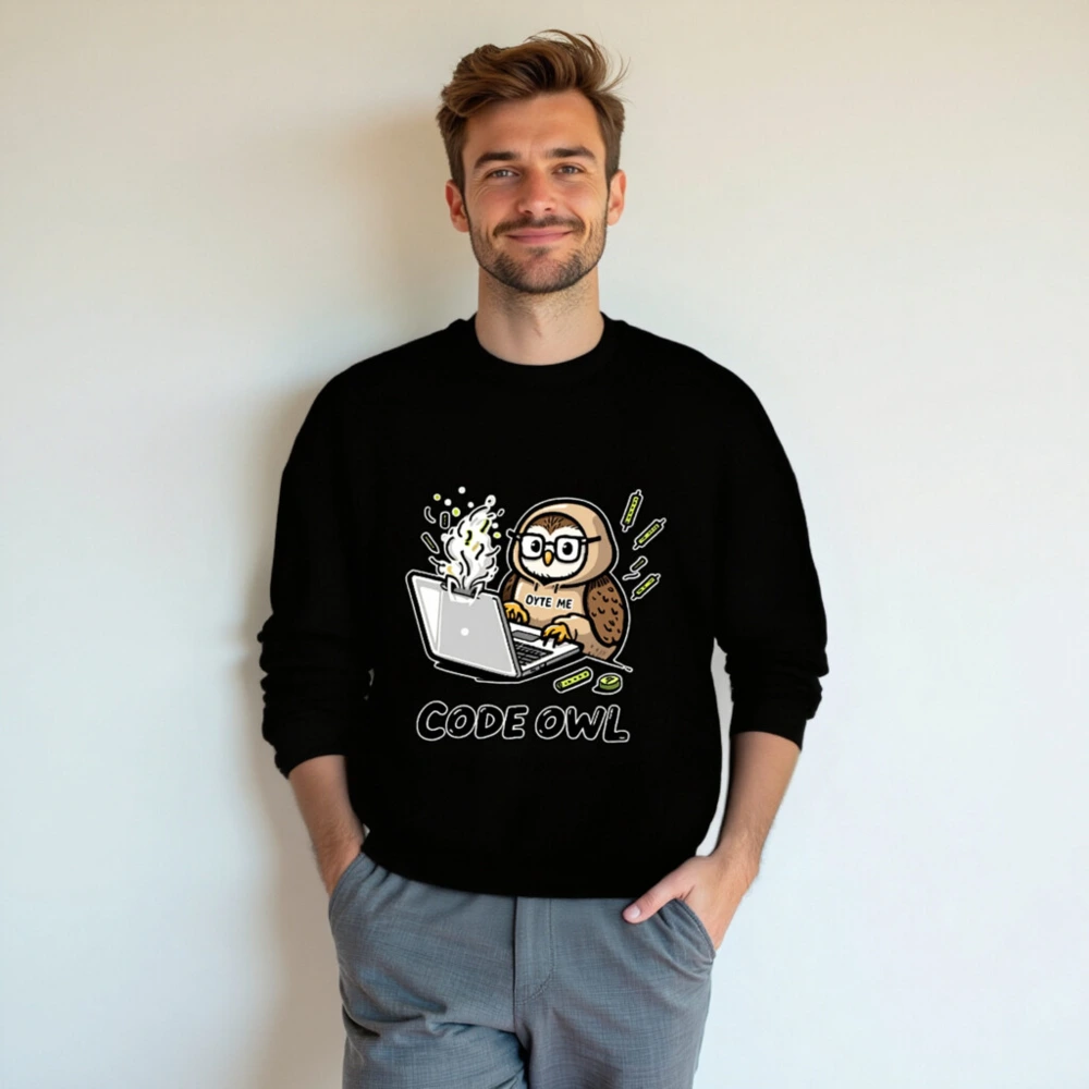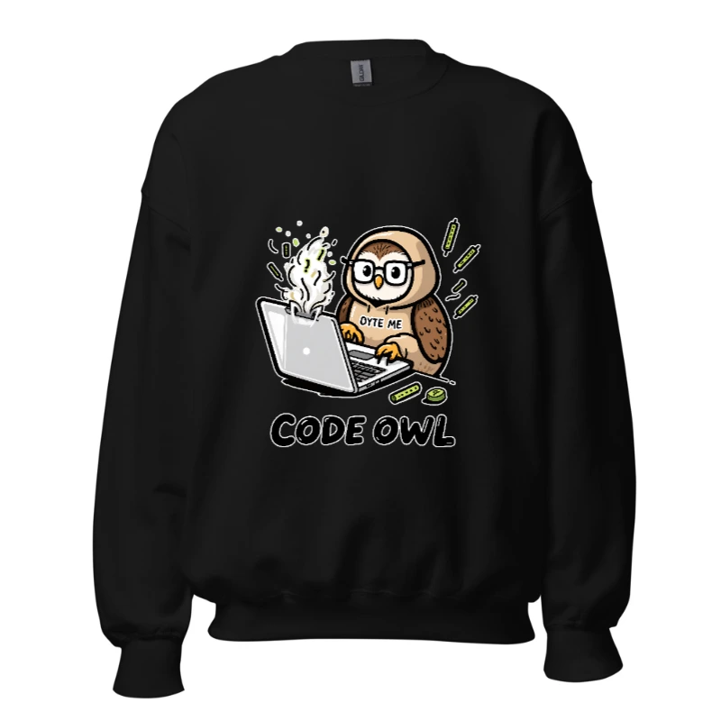 A playful unisex crew neck sweatshirt featuring a cartoon owl coding on a steaming laptop with ‘BYTE ME’ text. Perfect for developers, tech lovers, and nerdy humor fans. Soft cotton blend, comfortable fit, ideal for casual wear or coding sessions. Design includes subtle tech-themed accents—great gift for programmers!
