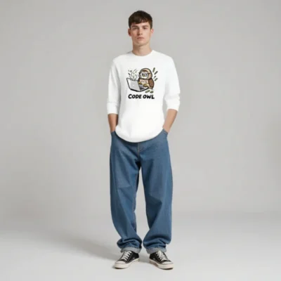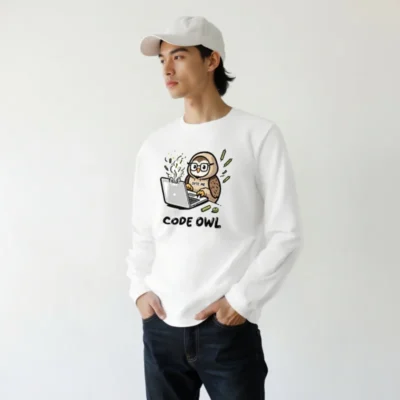 A fun, tech-savvy unisex long sleeve tee featuring a cartoon owl coding on a steaming laptop with ‘DYTE ME’ text. Perfect for developers, programmers, and owl lovers. Soft cotton blend, comfortable fit, ideal for casual wear or tech events. The playful ‘CODE OWL’ slogan adds humor to your wardrobe. Lightweight, breathable, and machine washable.