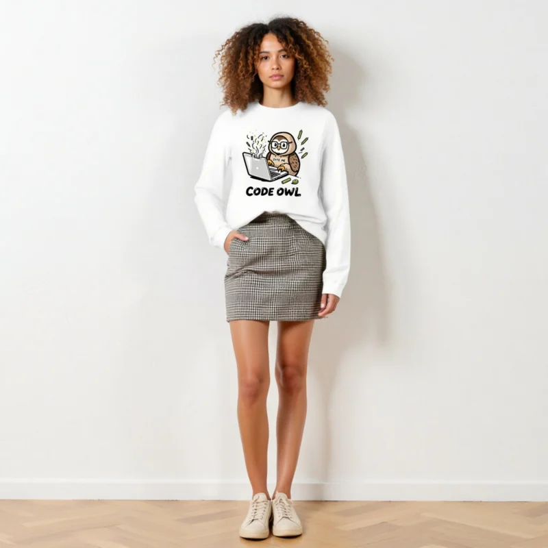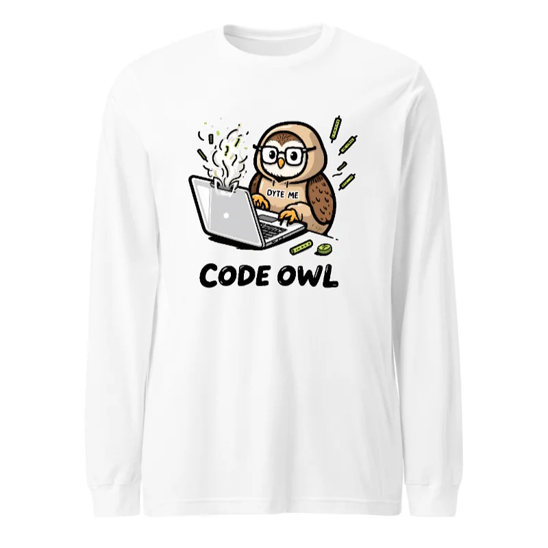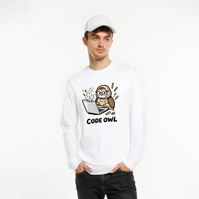 A fun, tech-savvy unisex long sleeve tee featuring a cartoon owl coding on a steaming laptop with ‘DYTE ME’ text. Perfect for developers, programmers, and owl lovers. Soft cotton blend, comfortable fit, ideal for casual wear or tech events. The playful ‘CODE OWL’ slogan adds humor to your wardrobe. Lightweight, breathable, and machine washable.