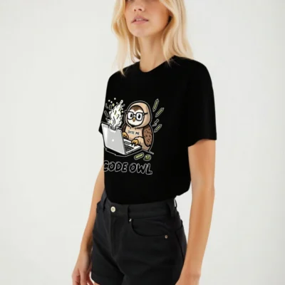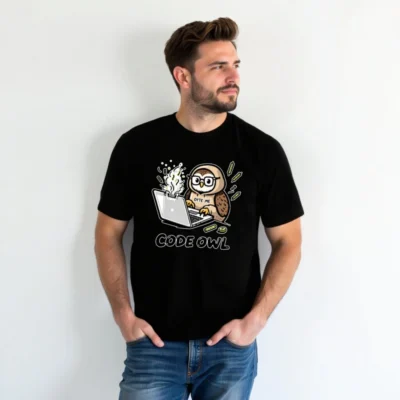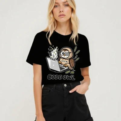Show off your coding passion with this unisex staple t-shirt featuring a cute owl typing on a laptop with ‘BYTE ME’ text and steamy code. Perfect for developers, tech lovers, and owl fans. Soft cotton blend, comfortable fit, versatile for daily wear. Ideal gift for programmers or tech enthusiasts. Designed for universal appeal—fun, geeky, and stylish.