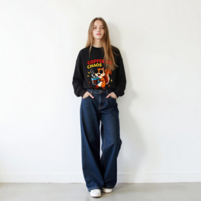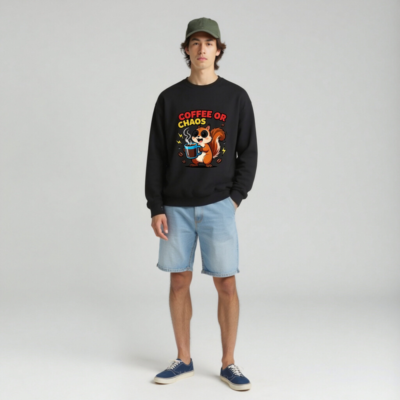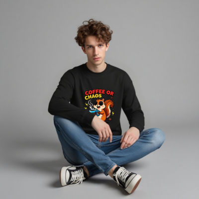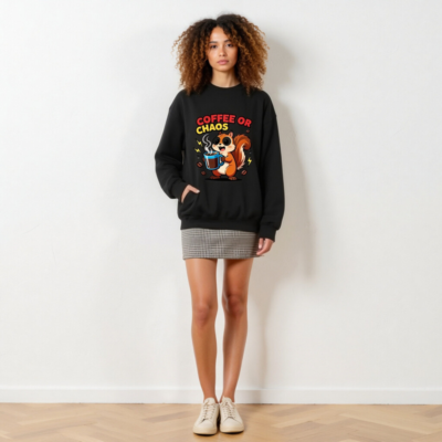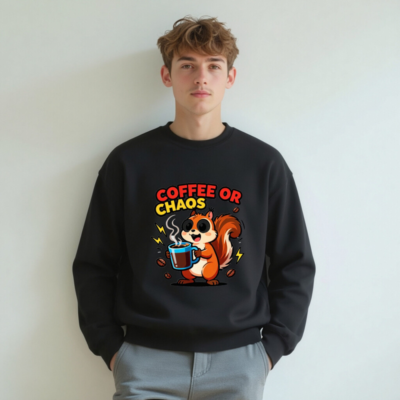 This unisex crew neck sweatshirt features a playful squirrel holding steaming coffee, surrounded by beans and lightning bolts—perfect for caffeine enthusiasts. The bold ‘COFFEE OR CHAOS’ text adds humor and personality. Soft, comfortable fabric ideal for daily wear. Great gift for teachers, students, or anyone who needs a dose of joy with their morning brew.