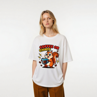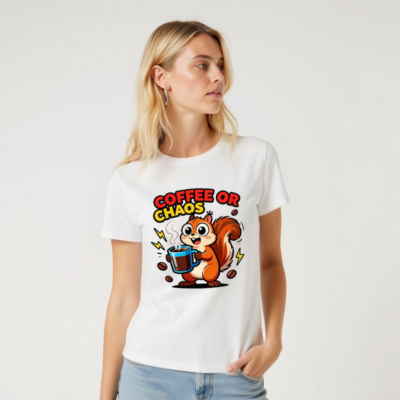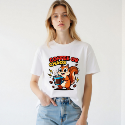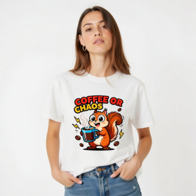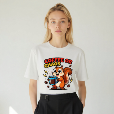 Cute squirrel holding steaming coffee mug with ‘COFFEE OR CHAOS’ text—fun, bold design for coffee lovers. Made from 100% unisex organic cotton for comfort and sustainability. Lightweight, soft, and machine-washable. Perfect for casual wear, gifts, or daily motivation. Ideal for those who embrace the morning rush—and a little chaos.