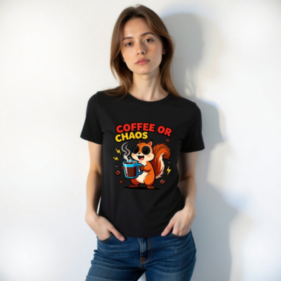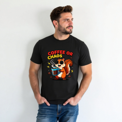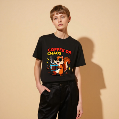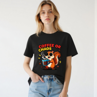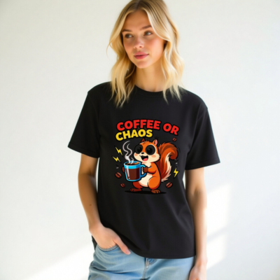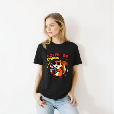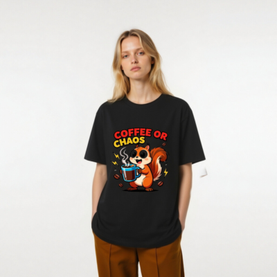 This unisex organic cotton t-shirt features a playful squirrel holding steaming coffee, surrounded by beans and lightning bolts, with the bold phrase ‘COFFEE OR CHAOS’. Made from 100% certified organic cotton for comfort and sustainability. Perfect for caffeine lovers and chaos enthusiasts alike. Machine washable, eco-friendly, and designed for everyday wear.