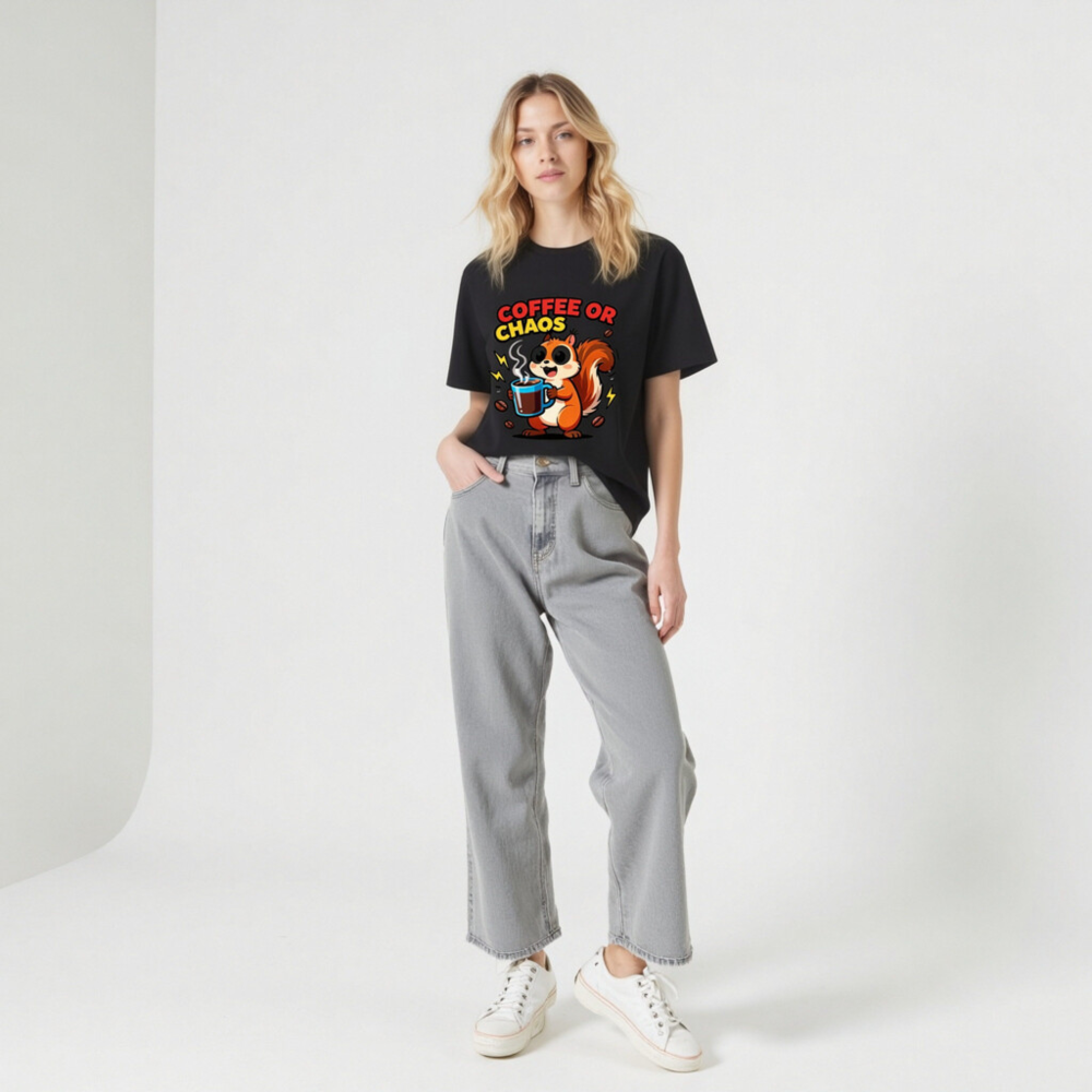 This unisex organic cotton t-shirt features a playful squirrel holding steaming coffee, surrounded by beans and lightning bolts, with the bold phrase ‘COFFEE OR CHAOS’. Made from 100% certified organic cotton for comfort and sustainability. Perfect for caffeine lovers and chaos enthusiasts alike. Machine washable, eco-friendly, and designed for everyday wear.