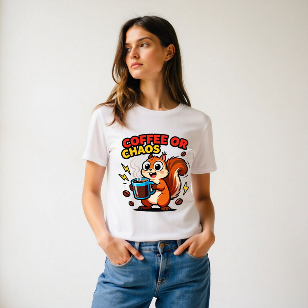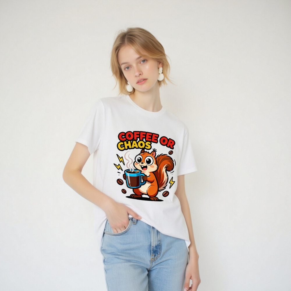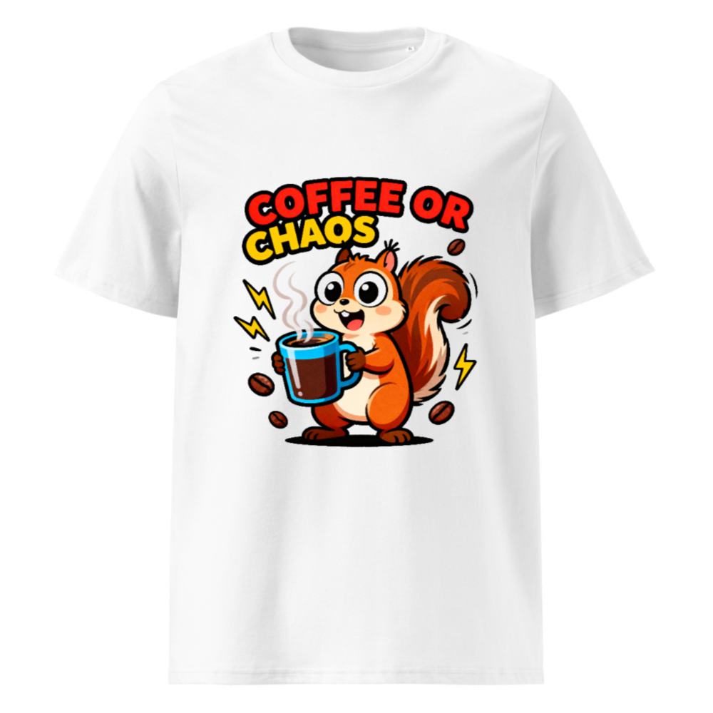 Cute squirrel holding steaming coffee mug with ‘COFFEE OR CHAOS’ text—fun, bold design for coffee lovers. Made from 100% unisex organic cotton for comfort and sustainability. Lightweight, soft, and machine-washable. Perfect for casual wear, gifts, or daily motivation. Ideal for those who embrace the morning rush—and a little chaos.