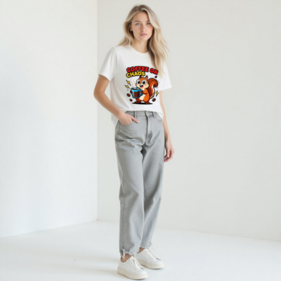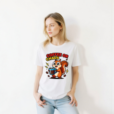 Cute squirrel holding steaming coffee mug with bold ‘COFFEE OR CHAOS’ text—perfect for caffeine lovers and chaos enthusiasts. Unisex staple t-shirt, soft cotton blend, classic fit. Ideal for daily wear, humor lovers, and coffee addicts. Design features playful lightning bolts and scattered beans. Comfortable, versatile, and eye-catching—your go-to casual tee.