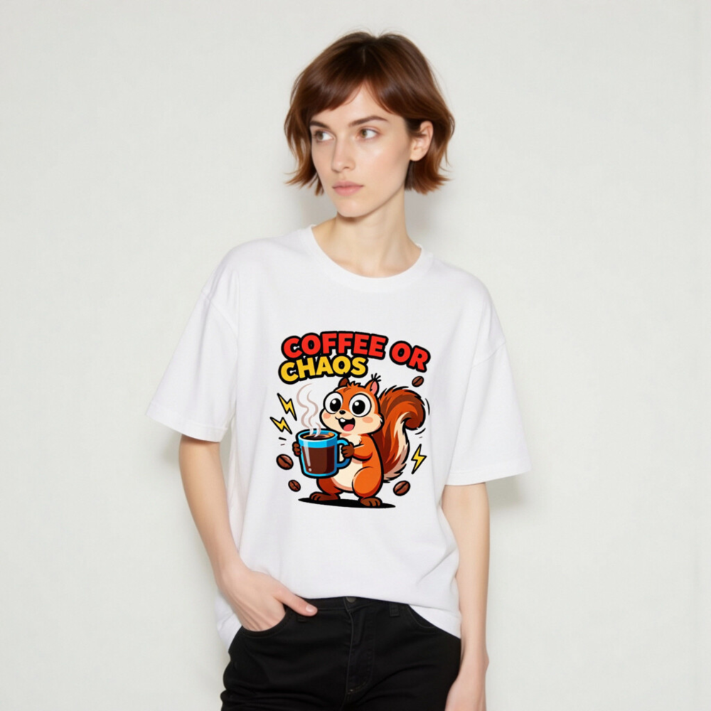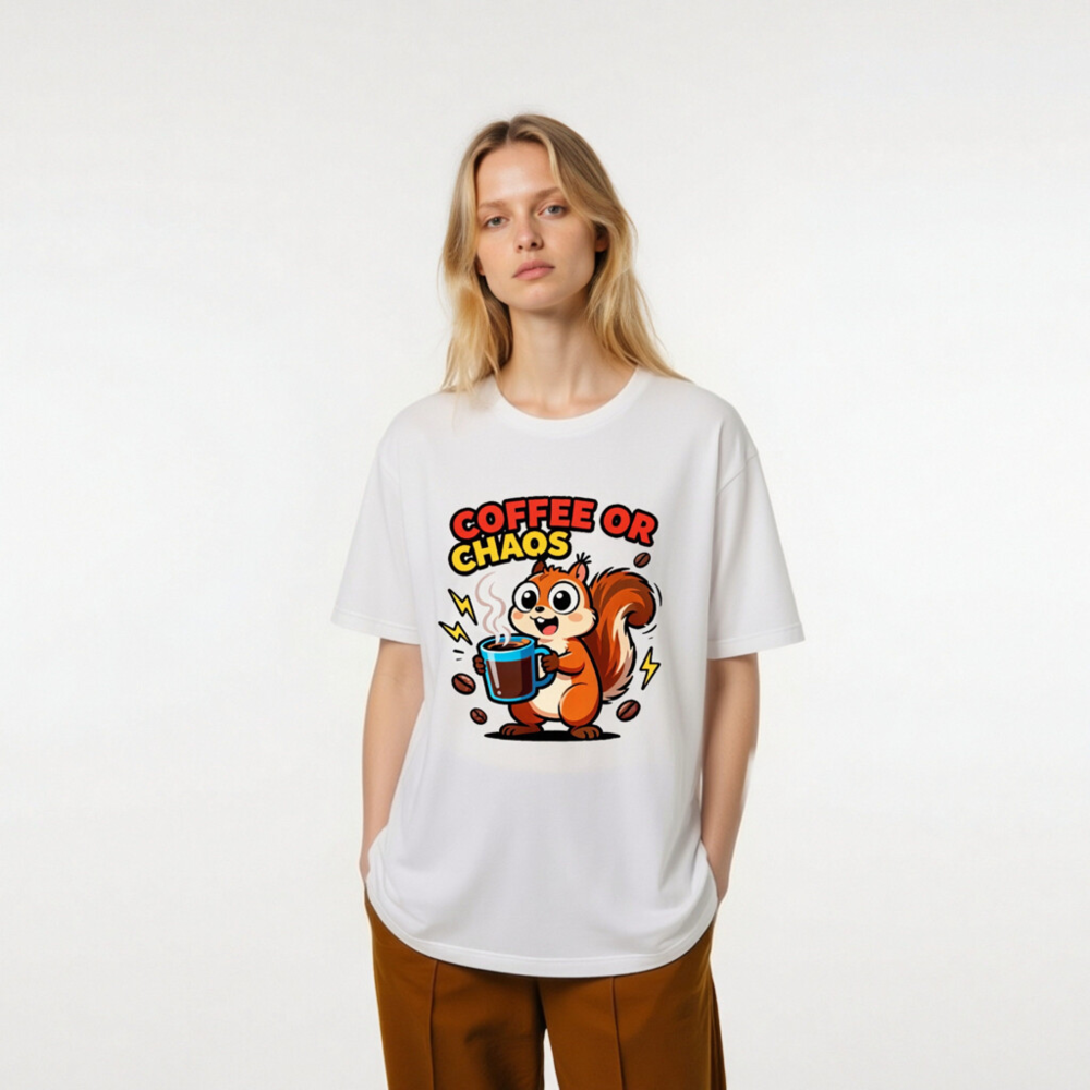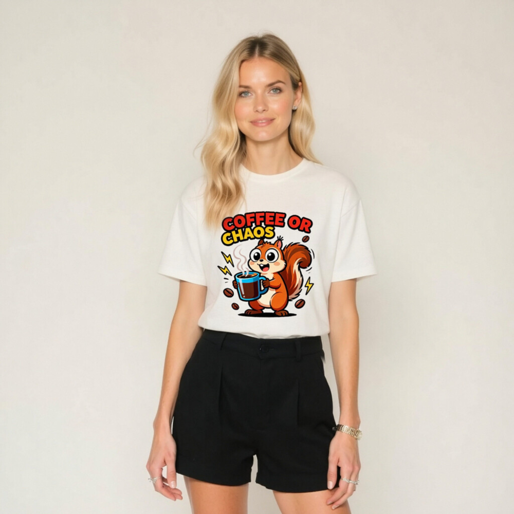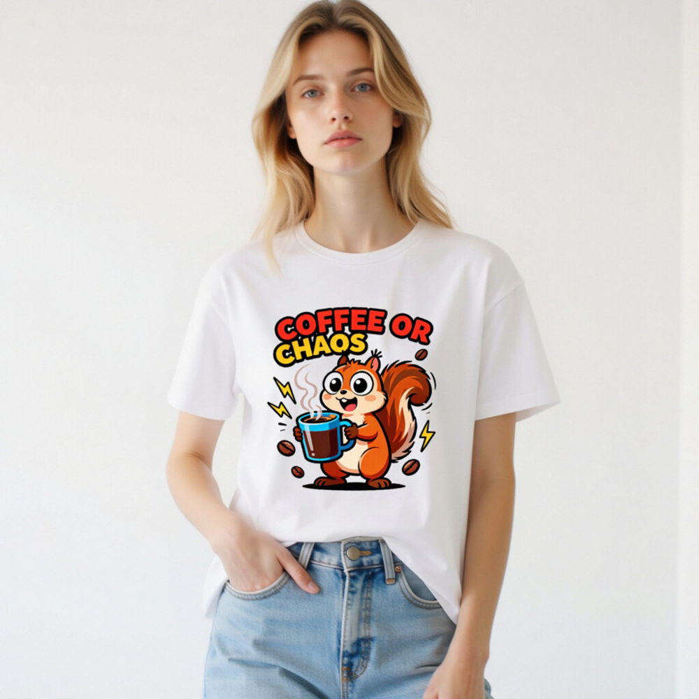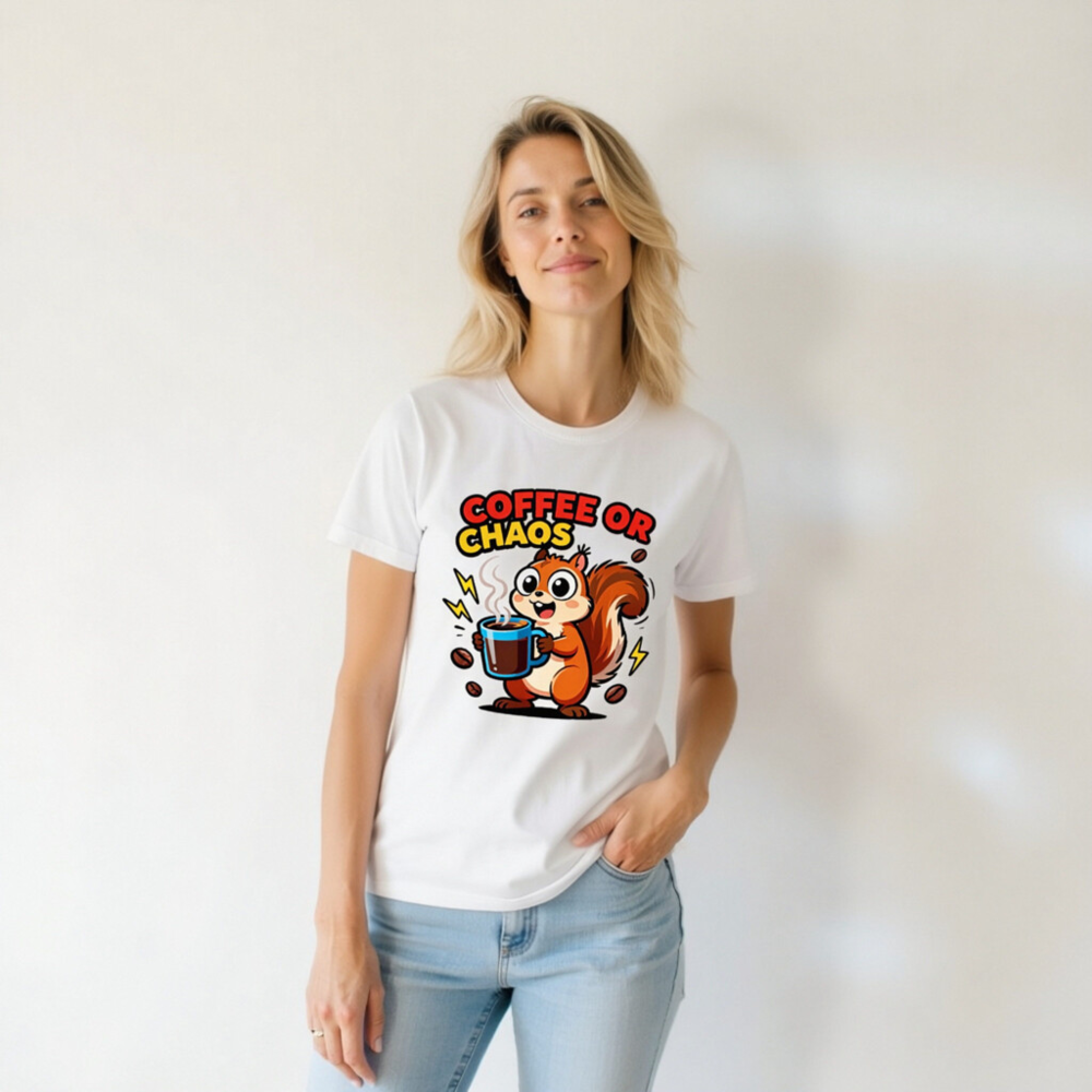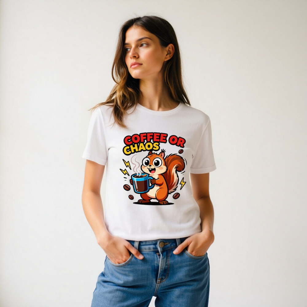 Cute squirrel holding steaming coffee mug with bold ‘COFFEE OR CHAOS’ text—perfect for caffeine lovers and chaos enthusiasts. Unisex staple t-shirt, soft cotton blend, classic fit. Ideal for daily wear, humor lovers, and coffee addicts. Design features playful lightning bolts and scattered beans. Comfortable, versatile, and eye-catching—your go-to casual tee.