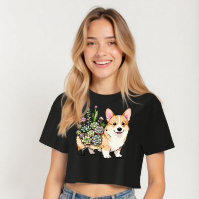 Corgi with Succulents Women’s Crop Top – Cute Dog Graphic Tee