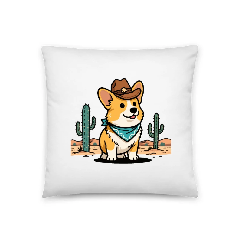 Adorable cowboy corgi wearing a brown hat and blue bandana, standing between green cacti in a desert scene. This 18″ x 18″ basic pillow features a charming, high-quality printed design perfect for adding fun Western flair to any room. Soft, versatile, and ready to brighten your space—ideal as a gift or personal decor.