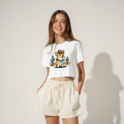 Adorable cowboy corgi graphic on a white women’s crop top, featuring desert cacti and western charm. This short sleeve t-shirt combines playful cartoon style with authentic western elements—perfect for casual wear or themed events. Soft cotton blend, relaxed fit, and stylish cropped hem. Ideal gift for corgi lovers and western fashion fans.