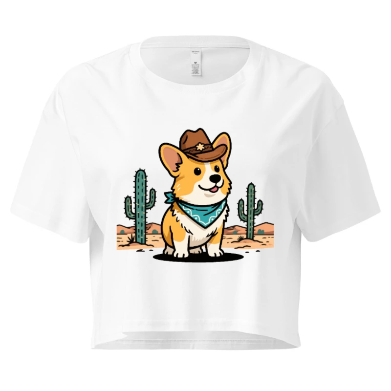 Adorable cowboy corgi graphic on a white women’s crop top, featuring desert cacti and western charm. This short sleeve t-shirt combines playful cartoon style with authentic western elements—perfect for casual wear or themed events. Soft cotton blend, relaxed fit, and stylish cropped hem. Ideal gift for corgi lovers and western fashion fans.