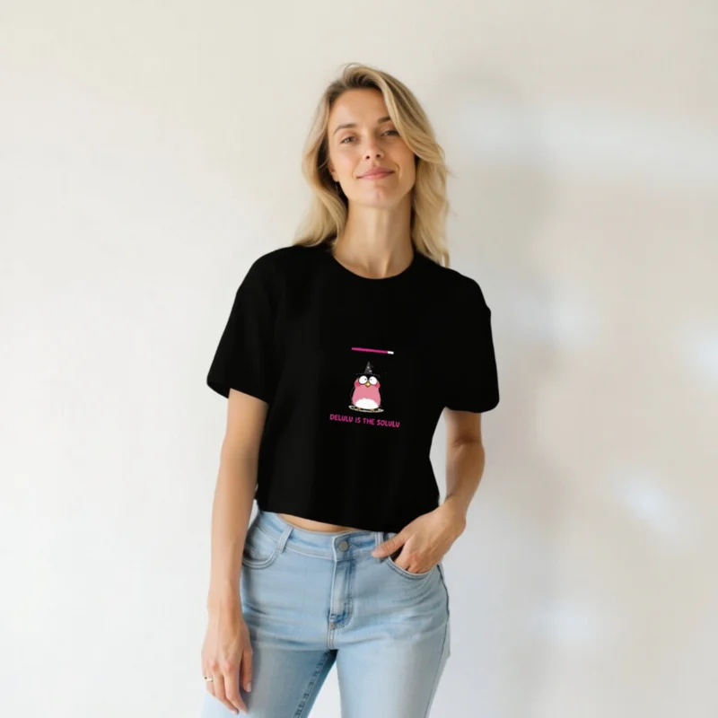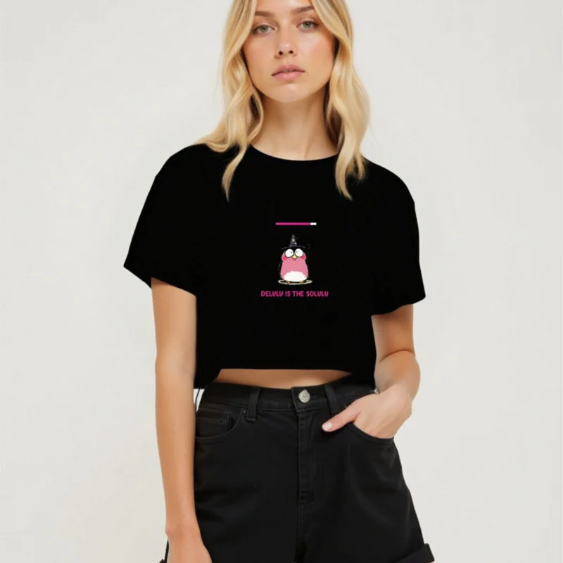 This women’s crop top features a charming pink owl wearing a wizard hat, with a magical wand above and ‘DELULU IS THE SOLULU’ text below. Designed for casual, playful style, this black short-sleeve cropped tee fits true to size and offers a comfortable, relaxed fit. Ideal for fans of whimsical, anime-inspired fashion—perfect for everyday wear or as a fun statement piece.