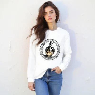 A unisex long sleeve tee featuring a mystical design: a glass flask with three skulls and golden stars, encircled by occult symbols and the text ‘DIVINE EXPERIMENT’. Ideal for witchy, gothic, or esoteric aesthetics. Soft cotton blend, comfortable fit for everyday wear. Perfect gift for mysticism lovers.