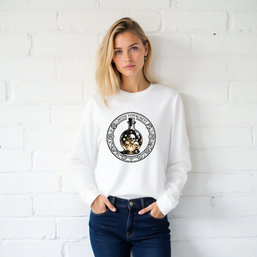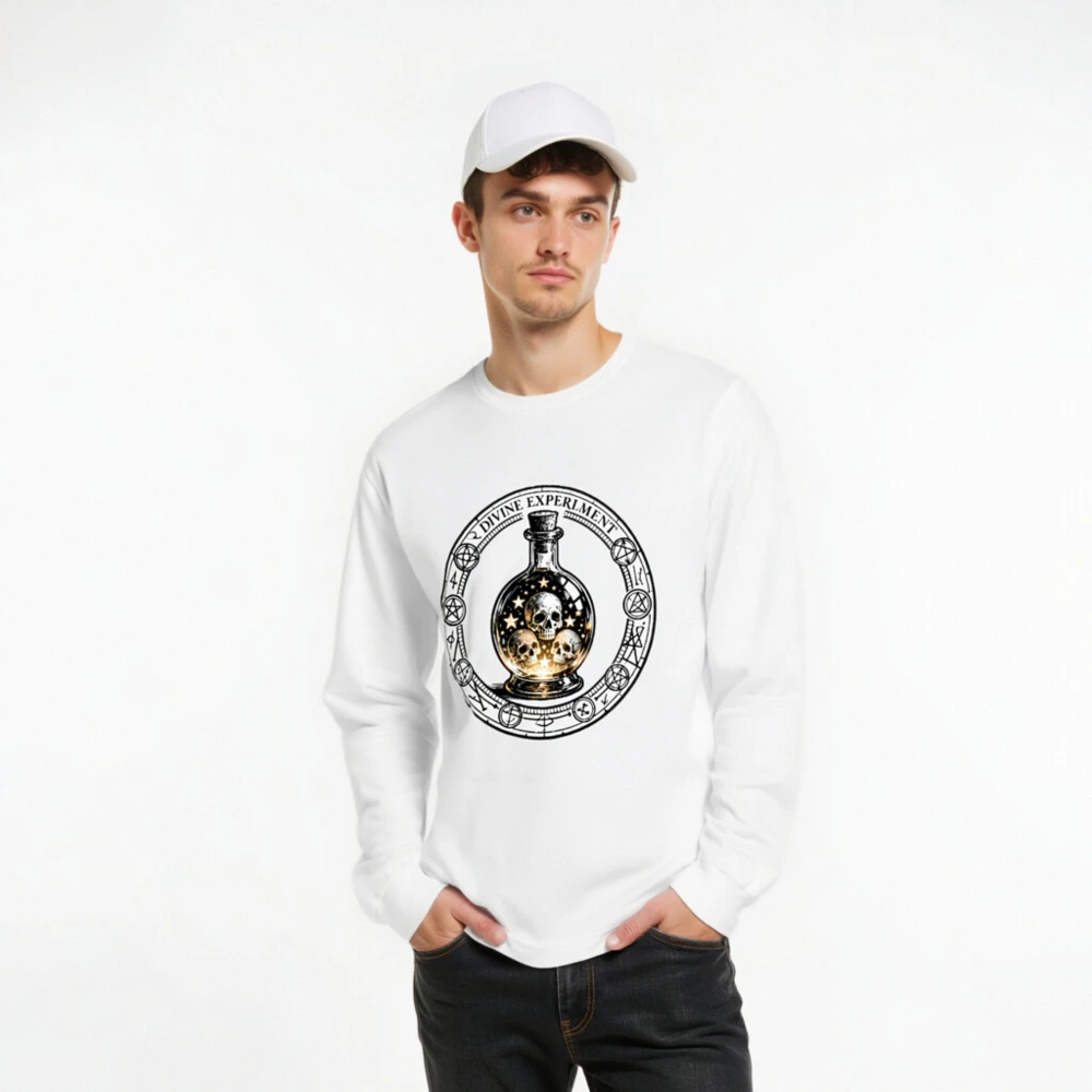 A unisex long sleeve tee featuring a mystical design: a glass flask with three skulls and golden stars, encircled by occult symbols and the text ‘DIVINE EXPERIMENT’. Ideal for witchy, gothic, or esoteric aesthetics. Soft cotton blend, comfortable fit for everyday wear. Perfect gift for mysticism lovers.
