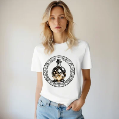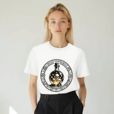 Divine Experiment T-Shirt – Unisex Organic Cotton Tee with Skull & Star Bottle Design