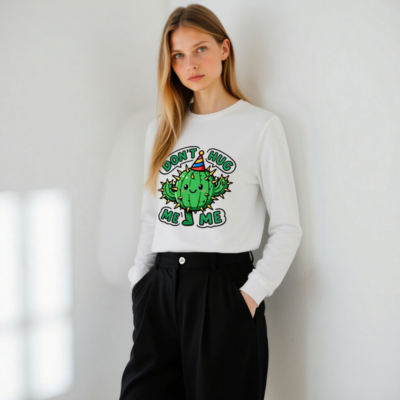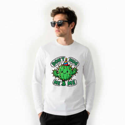 Adorable unisex long sleeve tee featuring a cheerful green cactus wearing a colorful party hat, with the playful text ‘DON’T HUG ME’ in bold green letters. Perfect for cactus lovers, birthday fans, or anyone who enjoys cute, quirky humor. Soft cotton blend, comfortable fit, great for casual wear or as a fun gift. Ideal for birthdays, holidays, or everyday joy.