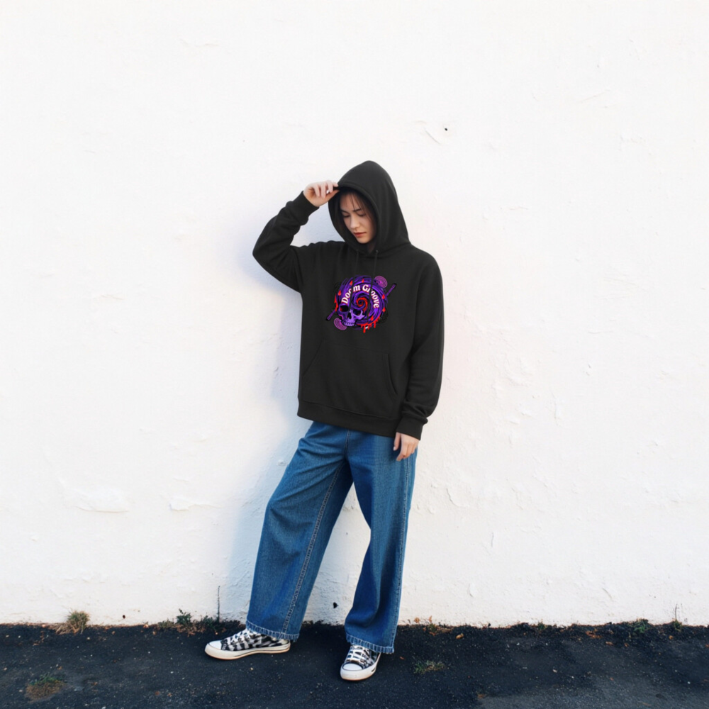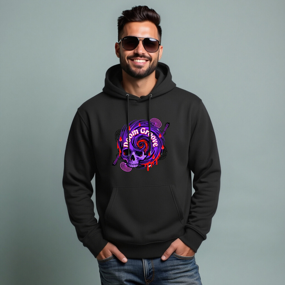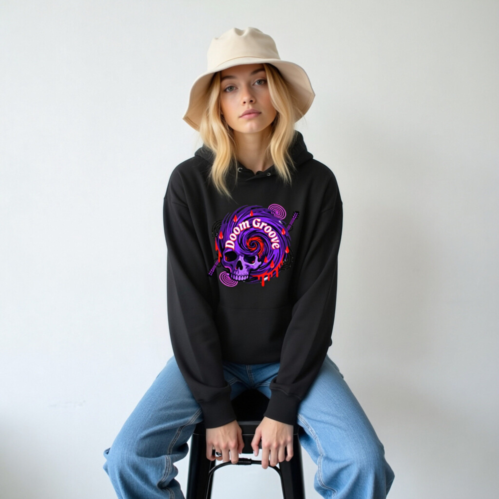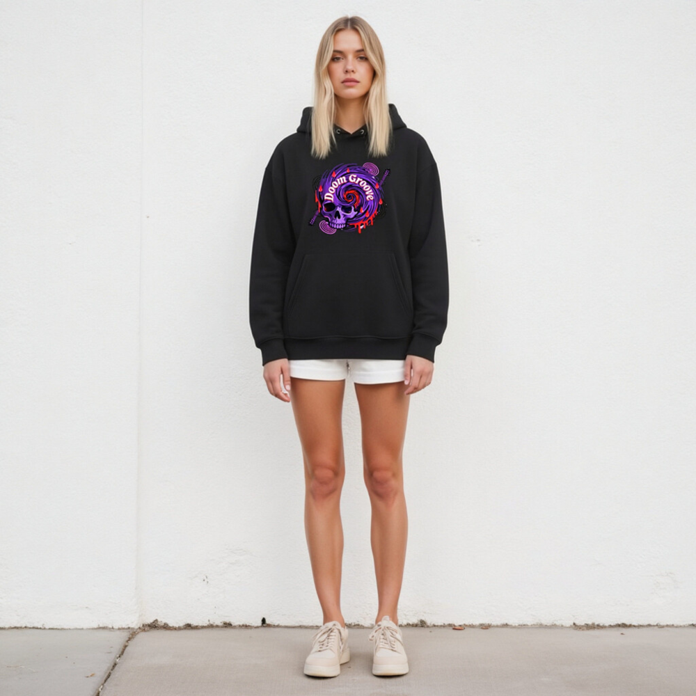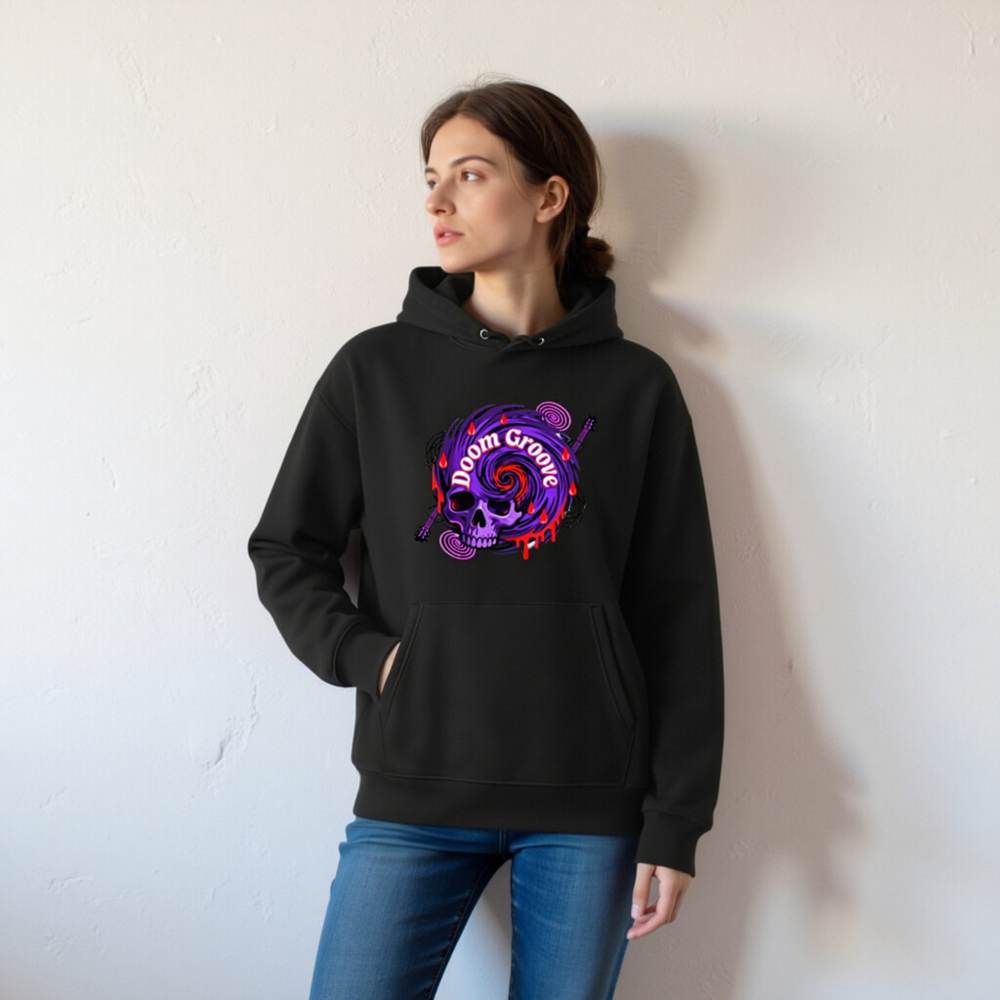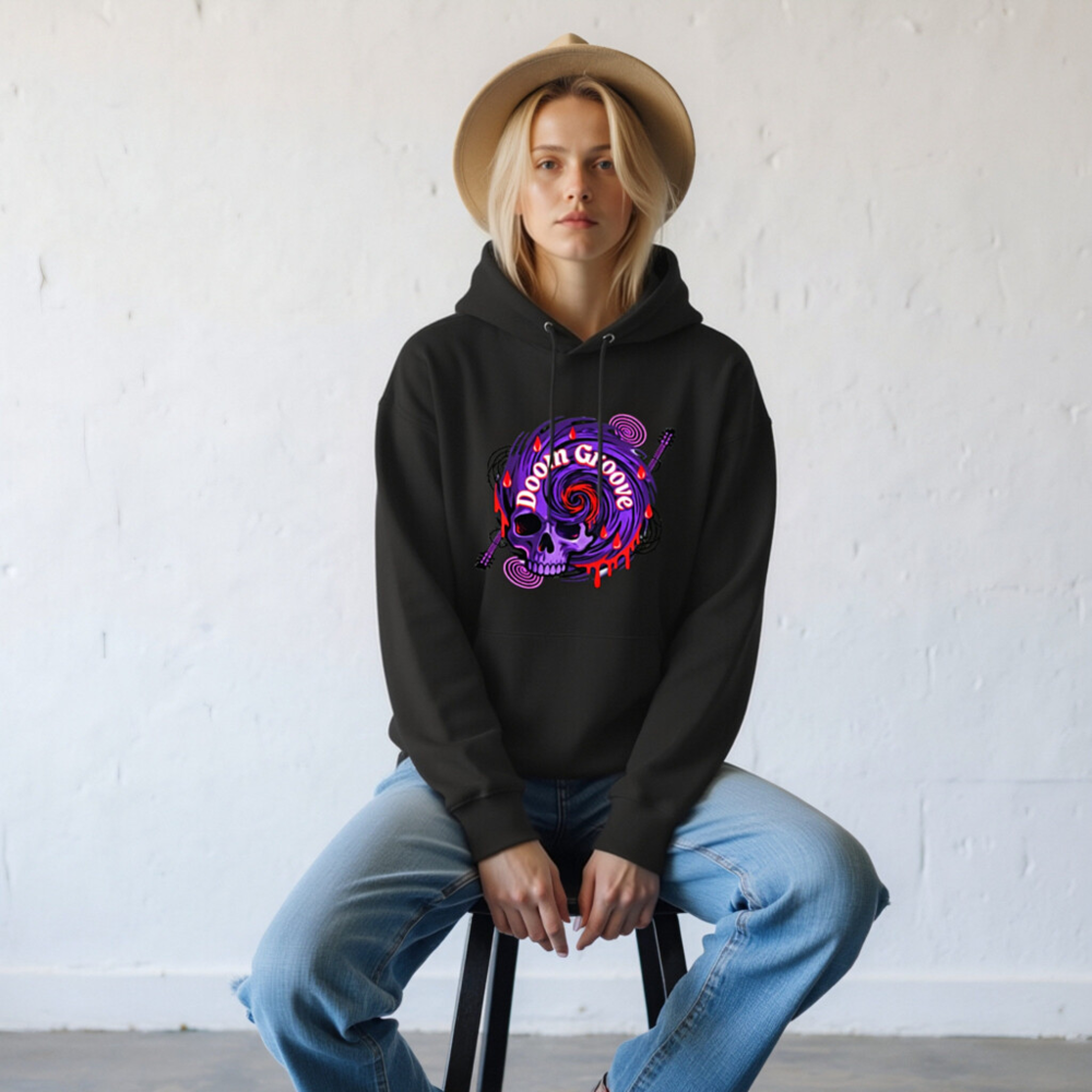 Eco-friendly unisex hoodie featuring a bold purple skull with swirling ‘Doom Groove’ text, red drip accents, and spiral motifs. Made from sustainable materials for conscious fashion lovers. Soft, comfortable, and stylish—perfect for goth, metal, or alternative fans seeking ethical apparel. Designed for everyday wear with a statement graphic that stands out.