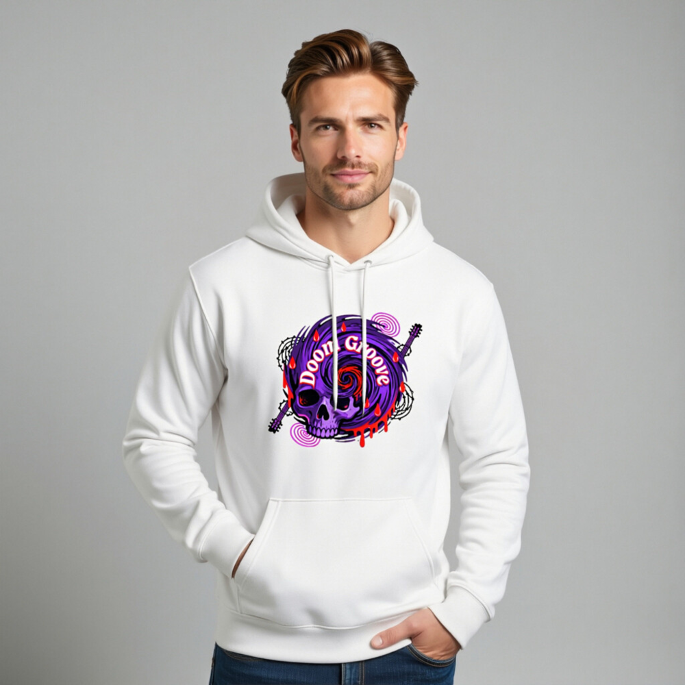 Featuring a bold purple skull with swirling ‘Doom Groove’ text, electric guitar motifs, and dripping red accents—this unisex essential eco hoodie combines dark rock aesthetics with sustainable fashion. Made from eco-friendly materials for comfort and conscience. Perfect for music lovers seeking edgy, ethical style.