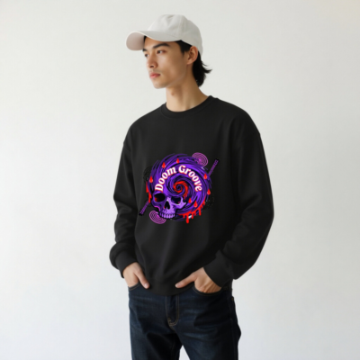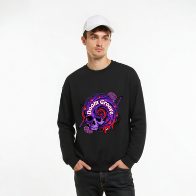 Show off your dark vibe with this unisex crew neck sweatshirt featuring a bold purple spiral skull design, dripping red accents, and ‘Doom Groove’ text. Perfect for fans of goth, metal, or retro-futuristic aesthetics. Soft cotton blend, comfortable fit, ideal for everyday wear or music events. Stand out with this eye-catching, high-contrast graphic tee—no extra tags, no filler. Ready to rock your wardrobe.