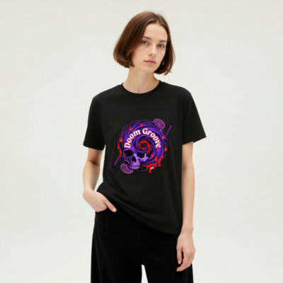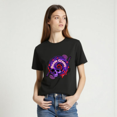 Featuring a vibrant purple swirling skull with red drips and guitar motifs, this unisex organic cotton t-shirt delivers bold doom grove aesthetic. Crafted for comfort and sustainability, it’s made from certified organic cotton—no synthetic additives. Ideal for music lovers who embrace dark, retro-futuristic style. Perfect for casual wear or festival looks. Eco-conscious design meets edgy artistry.