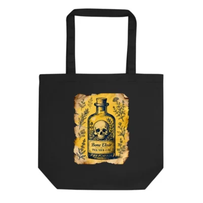 This eco-friendly black tote bag features a vintage-style ‘Bone Elixir’ label with skull and herbal motifs on aged parchment. Made from sustainable materials, it’s perfect for everyday use—reducing plastic waste while making a bold, gothic-chic statement. Lightweight, durable, and fully reusable, it combines ethical fashion with artistic flair.