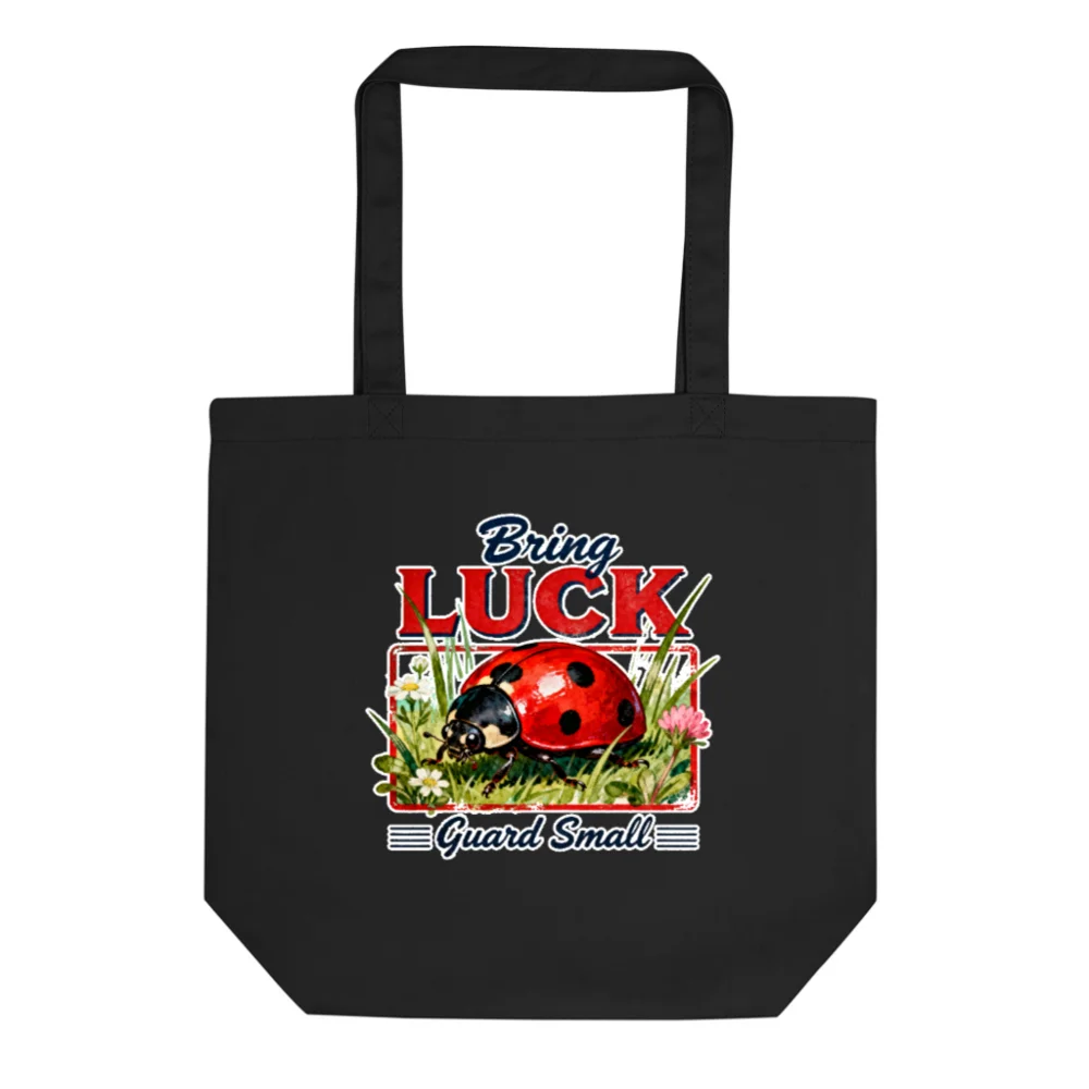 This eco-friendly black cotton tote bag features a charming vintage-style ‘Bring Luck, Guard Small’ ladybug design—perfect for everyday use. Made from durable, sustainable materials, it’s ideal for groceries, books, or beach trips. The sturdy handles and spacious interior offer practicality, while the playful, nostalgic print adds whimsy and positivity. Lightweight yet strong, this reusable shopping bag helps reduce plastic waste without sacrificing style. A thoughtful gift for nature lovers, gardeners, or anyone who appreciates cute, meaningful accessories. Machine washable and built to last.