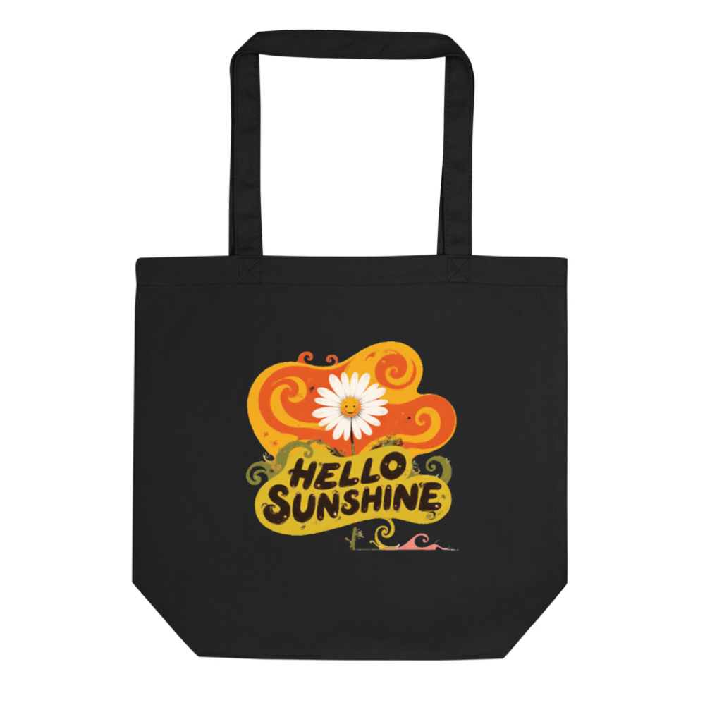 This eco-friendly black tote bag features a vibrant ‘Hello Sunshine’ design with a smiling daisy and retro swirls. Made from sustainable materials, it’s perfect for everyday use—lightweight, durable, and ideal for shopping or carrying essentials. The bold graphic adds cheerful style to your routine while supporting eco-conscious choices.