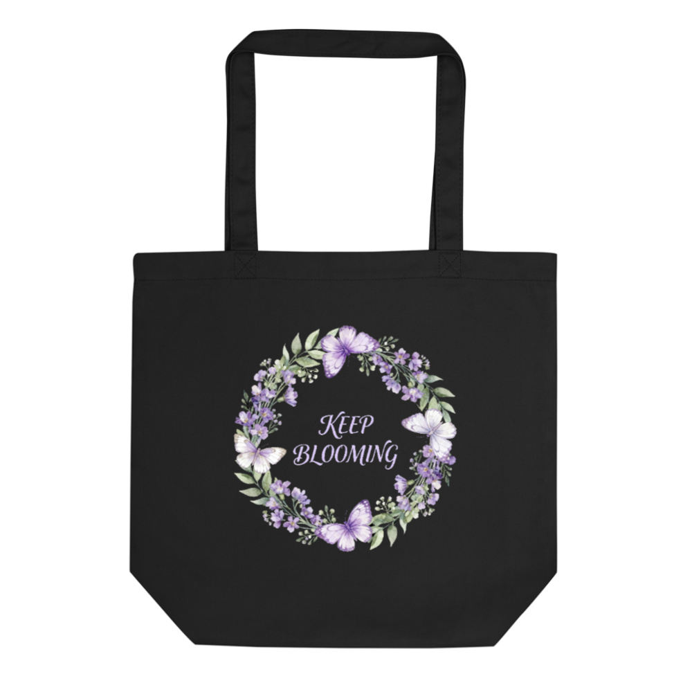 This eco-friendly black tote bag features a delicate purple floral wreath with butterflies and the uplifting phrase ‘Keep Blooming’—a stylish, sustainable choice for everyday use. Made from organic cotton, it’s designed for durability and conscious shopping. The minimalist yet elegant design makes it perfect for shoppers who value both aesthetics and environmental responsibility. Ideal as a gift or personal accessory—carry your values with every step.