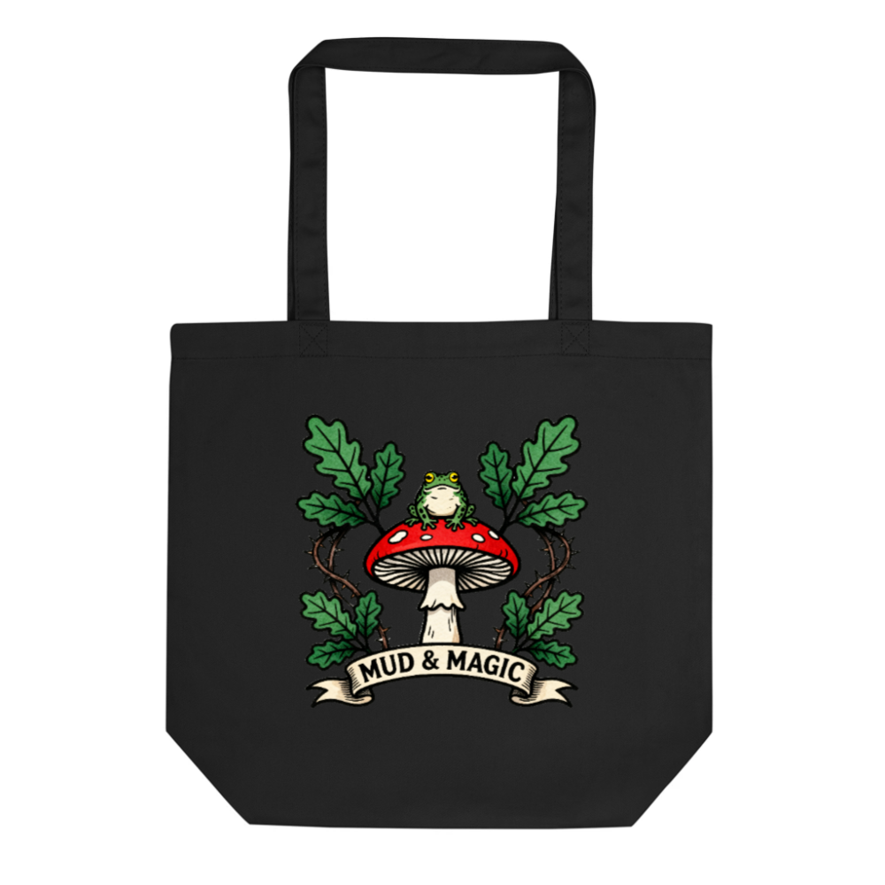 Handcrafted eco-friendly black tote bag featuring a whimsical frog perched atop a red-and-white mushroom, surrounded by oak leaves and thorny vines. The ‘Mud & Magic’ banner adds enchanting charm. Made with sustainable materials for everyday use—lightweight, durable, and perfect for shoppers who love nature-inspired art. Ideal for groceries, books, or as a thoughtful gift.