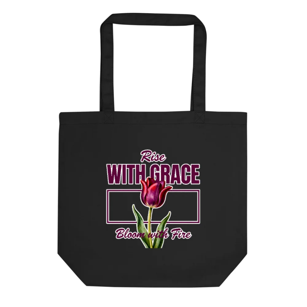 Stylish and sustainable, this eco-friendly black tote bag features a bold ‘Rise with Grace, Bloom with Fire’ design with a vibrant tulip graphic. Made from durable, reusable fabric, it’s perfect for shopping, work, or daily carry. The reinforced handles and spacious interior offer practicality without compromising on empowerment-inspired aesthetics. Ideal for conscious consumers who value both purpose and style. A meaningful gift for women celebrating strength, resilience, and grace.