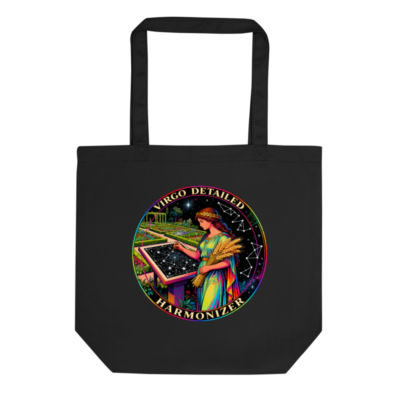 This eco-friendly black tote bag features a vibrant, detailed Virgo-themed design: a classical figure with wheat and star chart, surrounded by garden motifs and zodiac symbols. Made from sustainable canvas, it’s a stylish, planet-conscious accessory for astrology lovers. Ideal for everyday use—lightweight, durable, and ethically crafted.