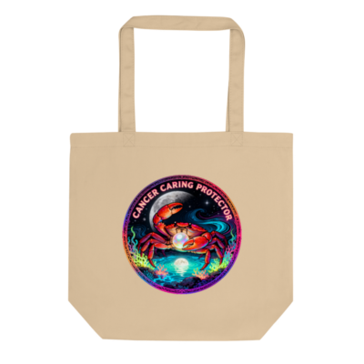 This eco-friendly tote bag features a vibrant, cosmic crab holding a pearl under moonlight—symbolizing Cancer zodiac’s nurturing strength. Made with sustainable materials for everyday use. The bold ‘Cancer Caring Protector’ text highlights its empowering message. Ideal for astrology lovers and eco-conscious shoppers seeking meaningful, stylish accessories.