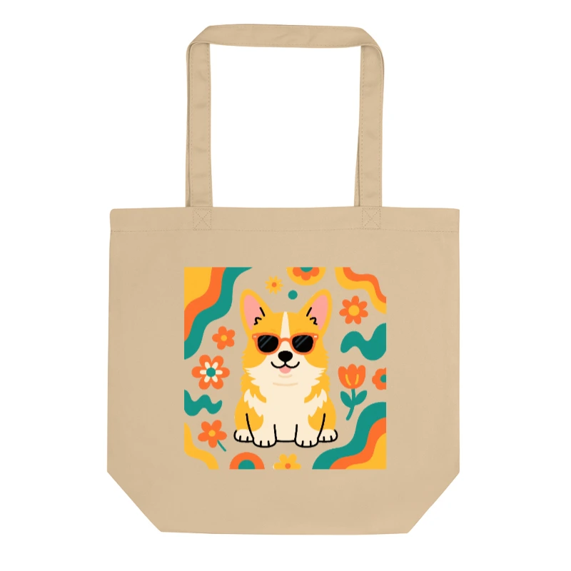 Handcrafted Eco Oyster Tote Bag featuring a charming corgi wearing sunglasses amid vibrant retro floral swirls. Made from sustainable canvas, this reusable tote combines playful design with eco-conscious values. Ideal for shopping, travel, or everyday use—lightweight, durable, and stylish. Supports zero-waste living without compromising on fun or function.