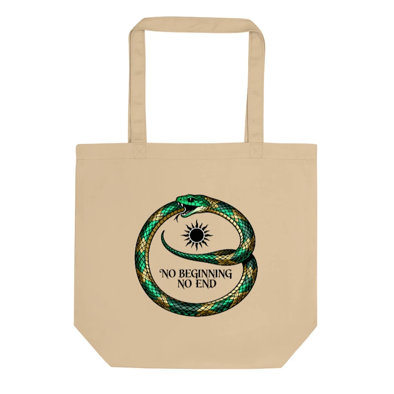 This Eco Oyster Tote Bag features a striking green and gold serpent coiled in an ouroboros symbol with a sun motif at its center. The design embodies the timeless phrase ‘No Beginning No End,’ reflecting cyclical wisdom and sustainability. Crafted for eco-conscious shoppers, this reusable tote combines bold artistry with practical everyday use. Ideal for shopping, travel, or as a statement accessory—where meaning meets minimalism.