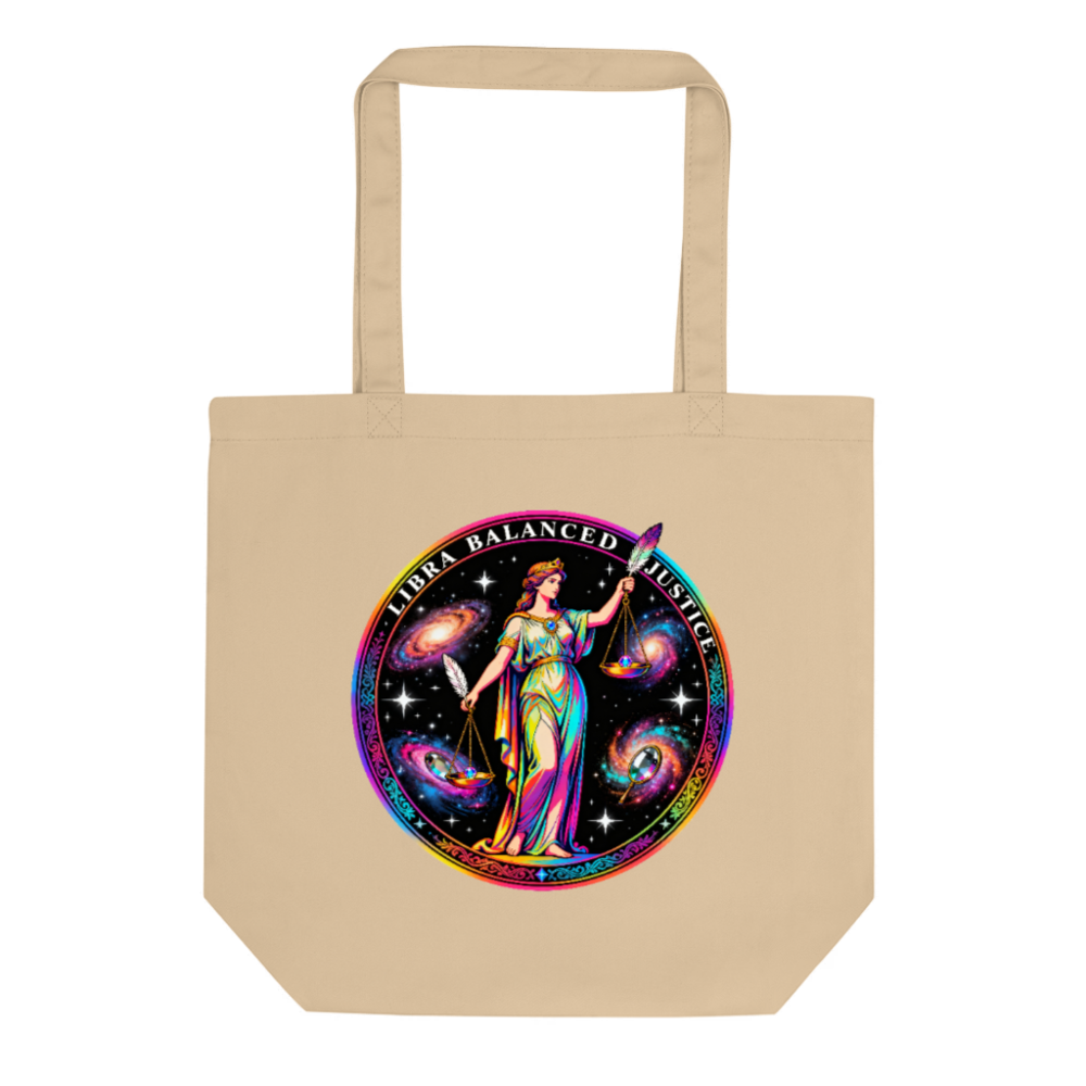 Handcrafted eco-friendly tote bag featuring the vibrant ‘Libra Balanced Justice’ cosmic design—symbolizing harmony, fairness, and celestial balance. Made from durable, sustainable canvas with sturdy handles for everyday use. Perfect for shoppers seeking ethical fashion with artistic flair. Lightweight, reusable, and responsibly made for conscious consumers.
